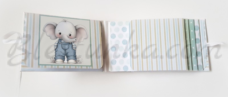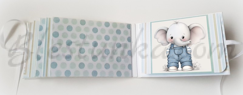 Mini album "Little elephant": Mini album of size 12х9 cm, decorated with paper of original design; contains 8 pages and two back covers, on which you can paste small photos, whishes or information of important events.