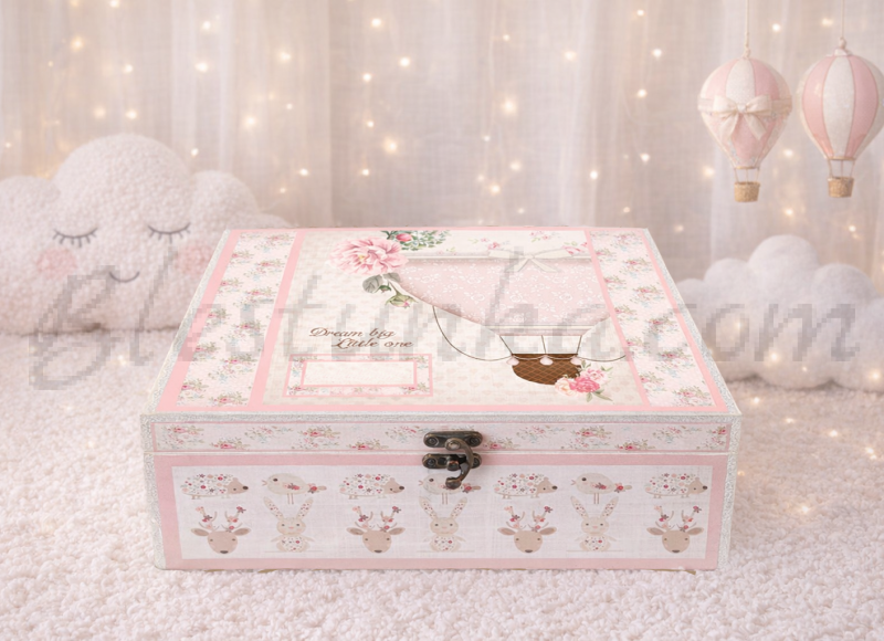 Caja para los tesoros del bebé "Viaje en globo" niña - grande: caja para los primeros tesoros del niño /primer pelo, cordón umbilical, primera joya, etc./.