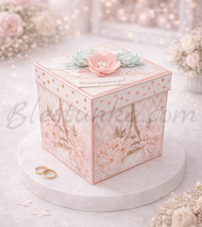 Caja sorpresa explosiva "Boda" en color melocotón - caja sorpresa, elaborada a mano de cartón, decorada con papel de diseño original, ornamentos en relieve, con tamaño 12х12x12 cm.