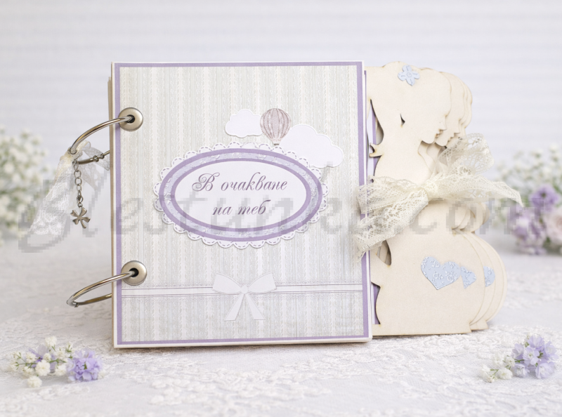 Албум за бременни "В очакване на теб" - момче - ръчно изработен и декориран албум, съчетаващ място за около 20 снимки, отделни листове за бележки и други спомени, съдържащ джобчета, тагчета, вътрешни разгъвки, декорации. Изработен е от бирен картон, дизайнерски хартии, дантели, декоративни елементи и др.