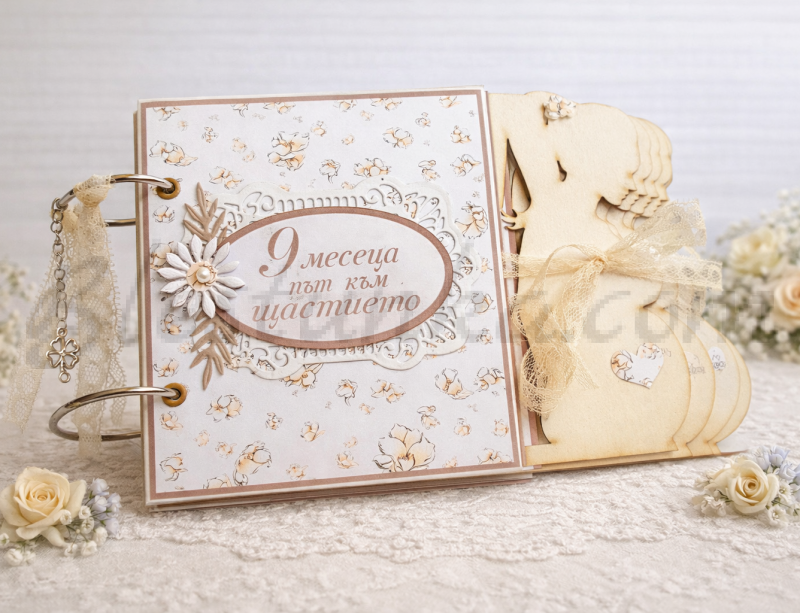 Албум за бременни "9 месеца" - ръчно изработен и декориран албум, съчетаващ място за около 20 снимки, отделни листове за бележки и други спомени, съдържащ джобчета, тагчета, вътрешни разгъвки, декорации. Изработен е от бирен картон, дизайнерски хартии, дантели, декоративни елементи и др.