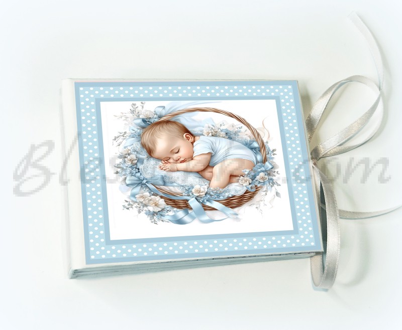 Мини албум "Сладкото бебе" в синьо - ръчно изработеното мини албумче е с размер 12х9 см, декорирано с дизайнерска хартия, съдържащо 8 страници и две вътрешни корици с разгъвки, на които могат да се залепят малки снимки на детенцето, пожелания или важни дати и събития свързани с него.